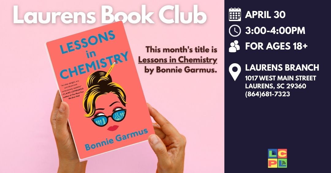 « All Events Laurens Book Club April 30 @ 3:00 pm - 4:00 pm « Greenville Cycling Classic Clear the closet art day! » This month’s title is Lessons in Chemistry by Bonnie Garmus. 40 Add to calendar Google Calendar iCalendar Outlook 365 Outlook Live Details Date: April 30 Time: 3:00 pm - 4:00 pm Event Category: Laurens County BUZZ Venue Laurens County Library 107 Jacobs Hwy # A Clinton, SC 29325 Phone 8646817323 Organizer Laurens County Library Laurens Branch