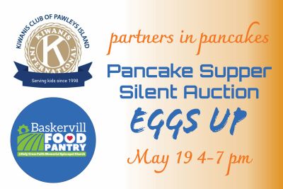 Join Baskervill Food Pantry and the Kiwanis Club for a Pancake Dinner fundraiser on Tuesday, May 19, from 4:00–7:00 p.m. at Eggs Up Grill in Pawleys Island.