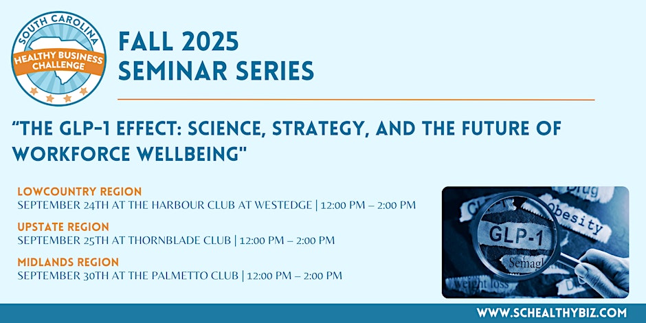 The South Carolina Healthy Business Challenge is hosting a statewide Fall Seminar Series focused on the evolving impact of GLP-1 medications on workforce health, chronic disease prevention, and employer strategy. Each regional luncheon will feature a cross-sector panel of experts from medicine, behavioral health, policy, and business—offering practical insights and opportunities for engagement.