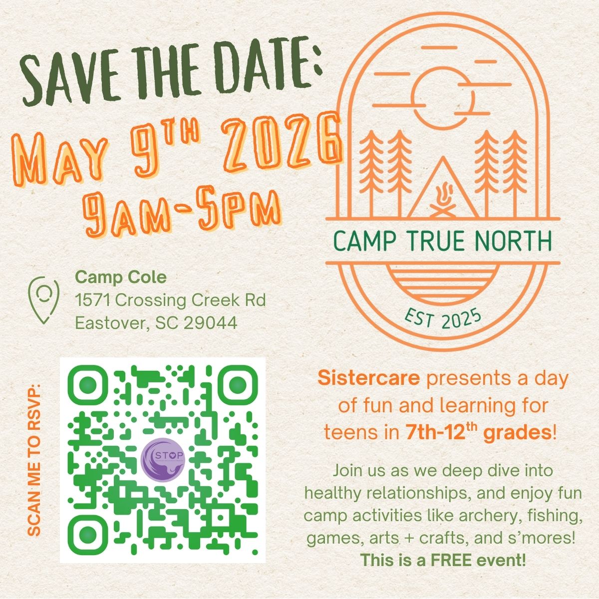 Sistercare is excited to host our 2nd Annual Camp True North on May 9th 2026! The goal of Camp True North is for teens to gather and explore the conversation around healthy relationships in a fun environment. The best part? It’s TOTALLY FREE!