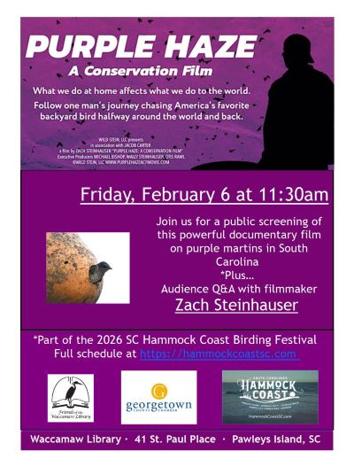 As part of the fourth annual SC Hammock Coast Birding Festival, the Waccamaw Library will offer a screening of Purple Haze: A Conservation Film, a documentary about the remarkable plight of purple martins in South Carolina and their annual migration to South America and back. As we follow one man’s journey chasing America’s favorite backyard bird halfway around the globe and back again, we come to discover that what we do at home affects what we do to the world.