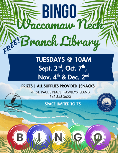 Prizes & snacks! Geared for 18+. All supplies included. Space limited to 75. For more information call 843-545-3623.