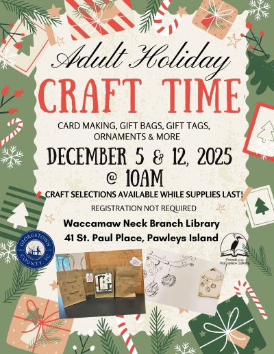 Join us for Adult Holiday Craft Time! Card Making, Grift Bags, Gift Tags, Ornaments and more! While supplies last! For more information call 843-545-3623.