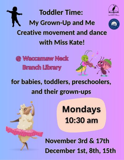 Join us Mondays in December (no class 12/22 & 12/29), in the Children's Area for My Grown-Up and Me creative movement and dance with Miss Kate! For babies, toddlers, preschoolers, and their grown-ups. For more information call 843-545-3349.