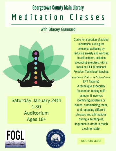 Join us for Adult Yoga on Wednesdays in January, 5:45-6:45 pm in the DeBordieu-Cross Auditorium. All levels welcome. Limited mats & blocks available. Donation class. For more information call 843-545-3623.
