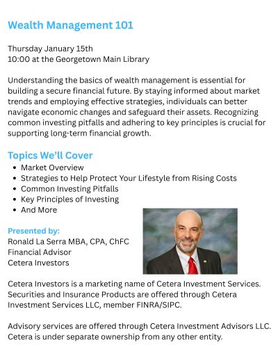 Join Ronald La Serra, MBA, CPA, ChFC and Financial Advisor with Cetera Investors for an informative session on wealth management. From understanding market basics to developing strategies to avoid common investment pitfalls, and more, Ron will help identify ways to support your future financial well-being.
