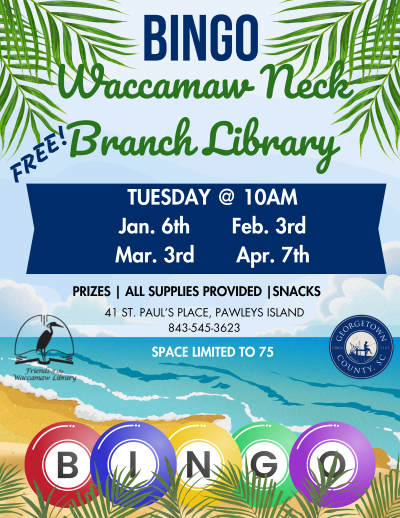 Join us for Adult Bingo on the first Tuesdays of the month between 10am-11:15 am in the DeBordieu-Cross Auditorium. Prizes & snacks! Geared for 18+. All supplies included. Space limited to 75. For more information call 843-545-3623.