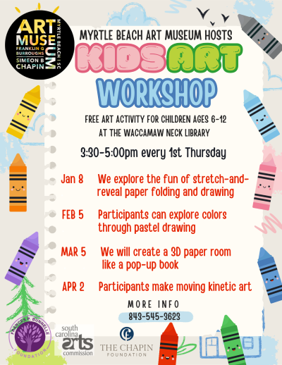 Join us the first Thursdays of the month for a free art activity for kids 6-12 years old at the Waccamaw Neck Library, in conjunction with the Myrtle Beach Arts Museum. This session children will create a 3D paper room, like a pop-up book.