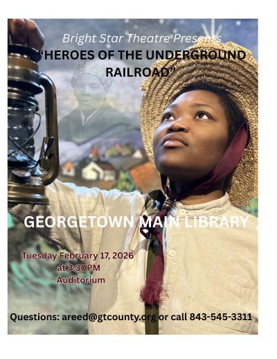 The Children's Services Department of the Georgetown Library is presenting a wonderful play FOR ALL AGES entitled "Heroes of the Underground Railroad" on Tuesday, Feb. 17th, at 3:30 pm, in the Library Auditorium. Parents, grandparents, and aunts and uncles, bring your children--and stay for a real treat! |