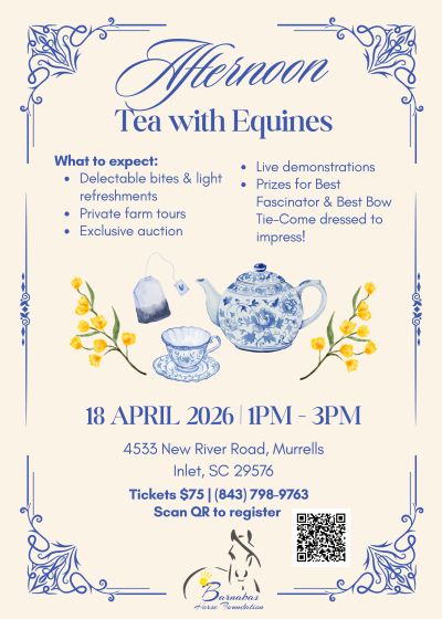 The Barnabas Horse Foundation will host its signature spring event, “Afternoon Tea with Equines,” on Saturday, April 18, 2026, from 1:00 to 3:00 PM at its serene farm at 4533 New River Road, Murrells Inlet, SC 29576. This elegant and meaningful gathering invites guests to experience the transformative power of equine-assisted services while enjoying an… |