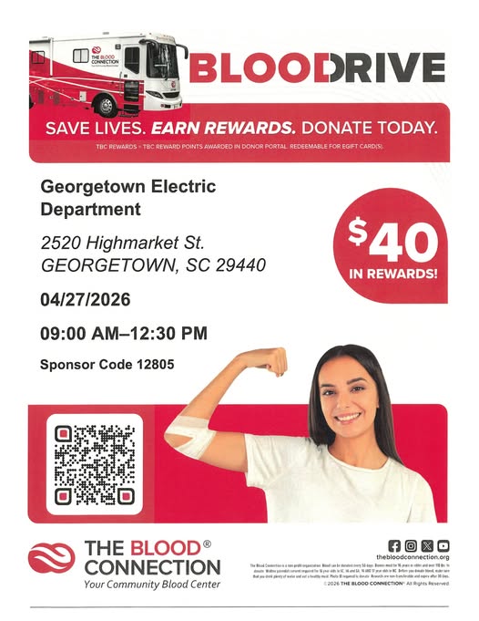 Come by the City of Georgetown Electric Department to participate in our blood drive. Register for our Blood Connection blood drive - sponsor code 12805 with QR code on the… |