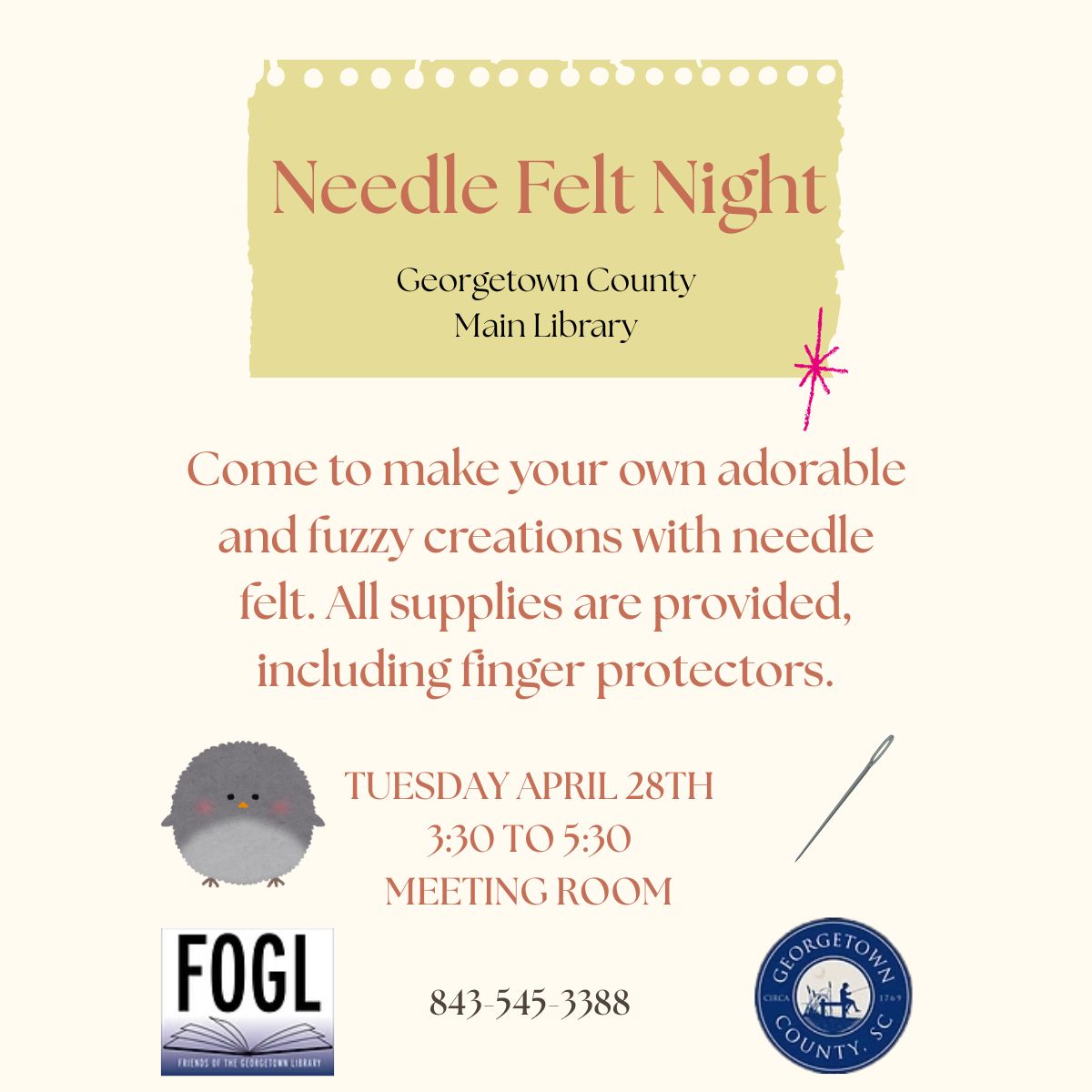 Join us at the library to make your own needle felt creation. All supplies are provided. |