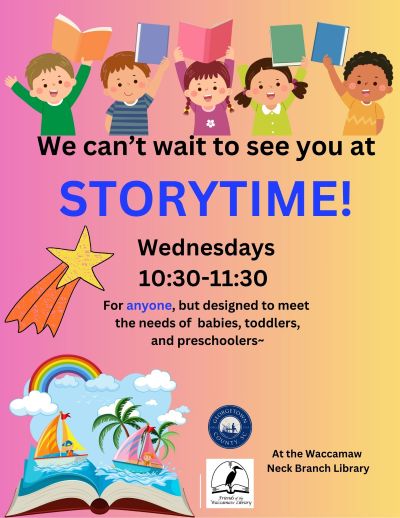 Waccamaw Neck Library - DeBordieu-Cross Auditorium 41 St Paul Place, Pawleys Island, SCJoin us Wednesdays in January from 10:30-11:00am in the DeBordieu-Cross Auditorium for stories, songs and early-literacy fun! For babies, toddlers, preschoolers and their caregiver(s). For more information call 843-545-3349.
