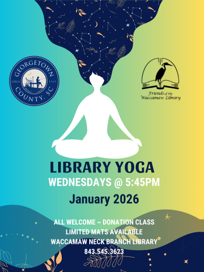 Waccamaw Neck Library 41 St Paul Place, Pawleys Island, SCJoin us for Adult Yoga on Wednesdays in January, 5:45-6:45 pm in the DeBordieu-Cross Auditorium. All levels welcome. Limited mats & blocks available. Donation class. For more information call 843-545-3623.