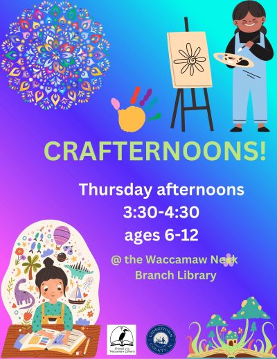 Waccamaw Neck Library 41 St Paul Place, Pawleys Island, SCJoin us Thursdays in January from 3:30-4:30 pm in the Children's Area for hands-on art projects for ages 6-12. For more information call 843-545-3349.
