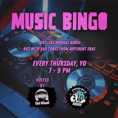 Music Bingo Come join us and DJ Dani for some rocking tunes & fun bingo! Every Thursday we start music bingo at 7 PM and do four fun rounds. First three rounds you have a chance to win $15 dollar gift cards & the last round is our money round. This is a night you… |