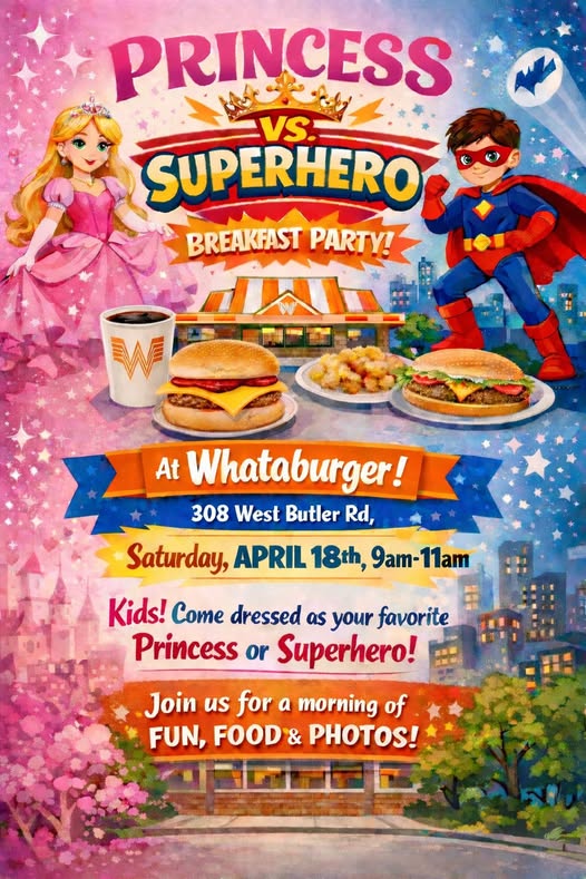 Calling all royalty and heroes! Get ready for a morning of magic and adventure at Whataburger. We are hosting a Princess vs. Superhero Breakfast Party, and you’re invited to fly or carriage-ride over for the fun! When: Saturday, April 18th Time: 9:00 AM – 11:00 AM Where: Whataburger (308 West Butler Rd.) What to Expect:…