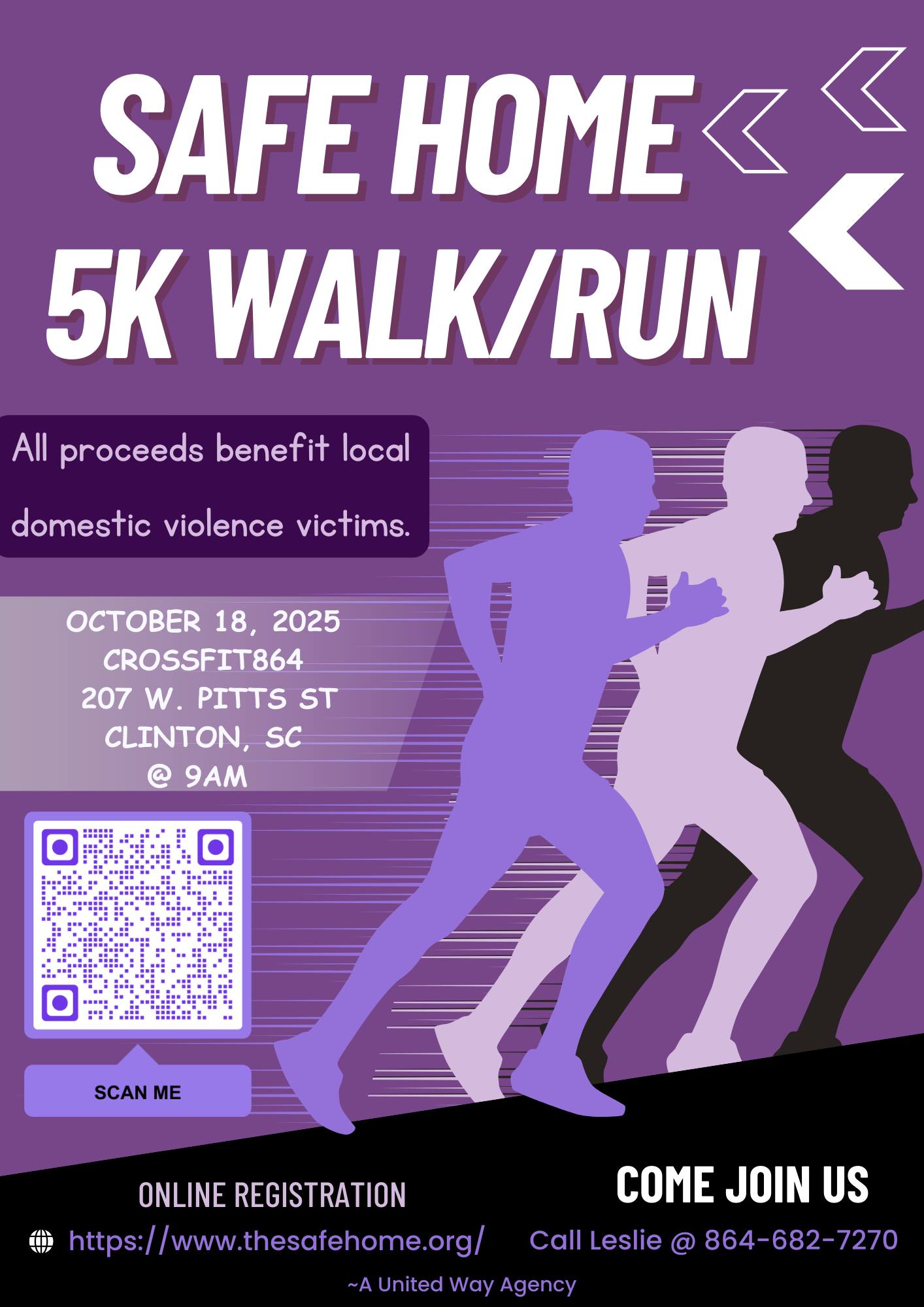 Save the date for our annual Laurens County Safe Home 5k Run/Walk on October 18, 2025, at CrossFit864—looking forward to seeing you there for a great event supporting a vital cause!