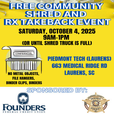 Laurens County residents will have an opportunity to safely dispose of sensitive documents and unused medications at a Free Community Shred and RX Takeback Event on Saturday, October 4, 2025, from 9:00 a.m. to 1:00 p.m. (or until the shred truck is full). The event will be held at Piedmont Technical College (Laurens Campus), 663…