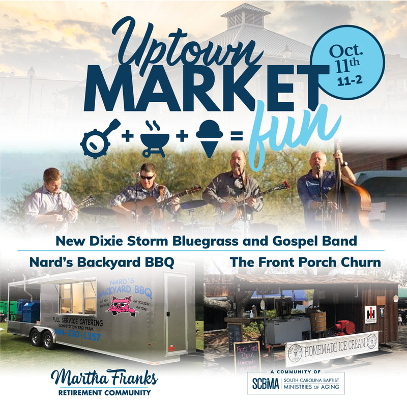 Join Martha Franks Retirement Community at the Uptown Market in Greenwood on Saturday October 11th from 11:00Am to 2:00PM. Bring a chair and let's celebrate Fall with the New Dixie Storm Bluegrass and Gospel Band, Nard's Backyard BBQ and The Front Porch Homemade Ice Cream.