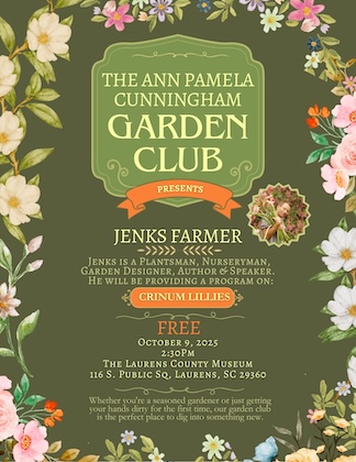 The Laurens County Museum will welcome noted garden designer, author, and plantsman Jenks Farmer on Thursday, October 9, at 2:30 p.m. Farmer will present a lecture on the heritage plant Crinum Lilies at the museum, located at 116 South Public Square in Laurens. Farmer is well known across South Carolina and beyond for his expertise…
