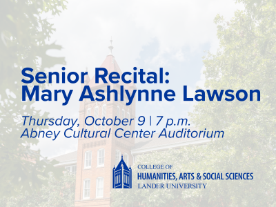 Lander University invites the Greenwood and Lander communities to attend a student recital Thursday, Oct. 9, by Mary Ashlynne Lawson, a senior music education major. The program is free and open to the public and will begin at 7 p.m. at the Abney Cultural Center Auditorium. About the Event: Mary Ashlynne Lawson, a senior music…