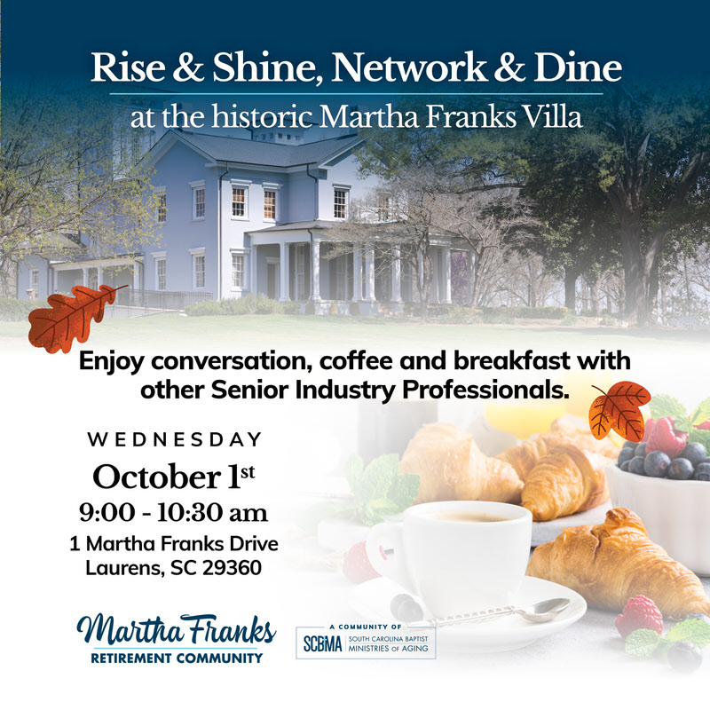 Rise & Shine, Network & Dine at the Martha Franks historic Villa. Enjoy conversation, coffee and breakfast with other Senior Industry Professionals. RSVP to Lynn McQueen [email protected] (864)420-2816