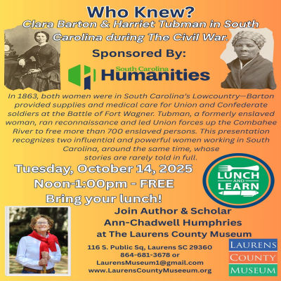 Who knew? In 1863, both Clara Barton, founder of the American Red Cross, and Harriet Tubman, a formerly enslaved woman who led more than 700 enslaved persons to freedom, were both in the South Carolina Lowcountry. This presentation recognizes the contributions of both influential and powerful women and their contributions to humanity. Ann-Chadwell Humphries will…
