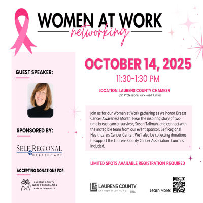 Join us for our Women at Work gathering as we honor Breast Cancer Awareness Month! Hear the inspiring story of two-time breast cancer survivor, Susan Tallman, and connect with the incredible team from our event sponsor, Self Regional Healthcare’s Cancer Center. We’ll also be collecting donations to support the Laurens County Cancer Association. Lunch is…