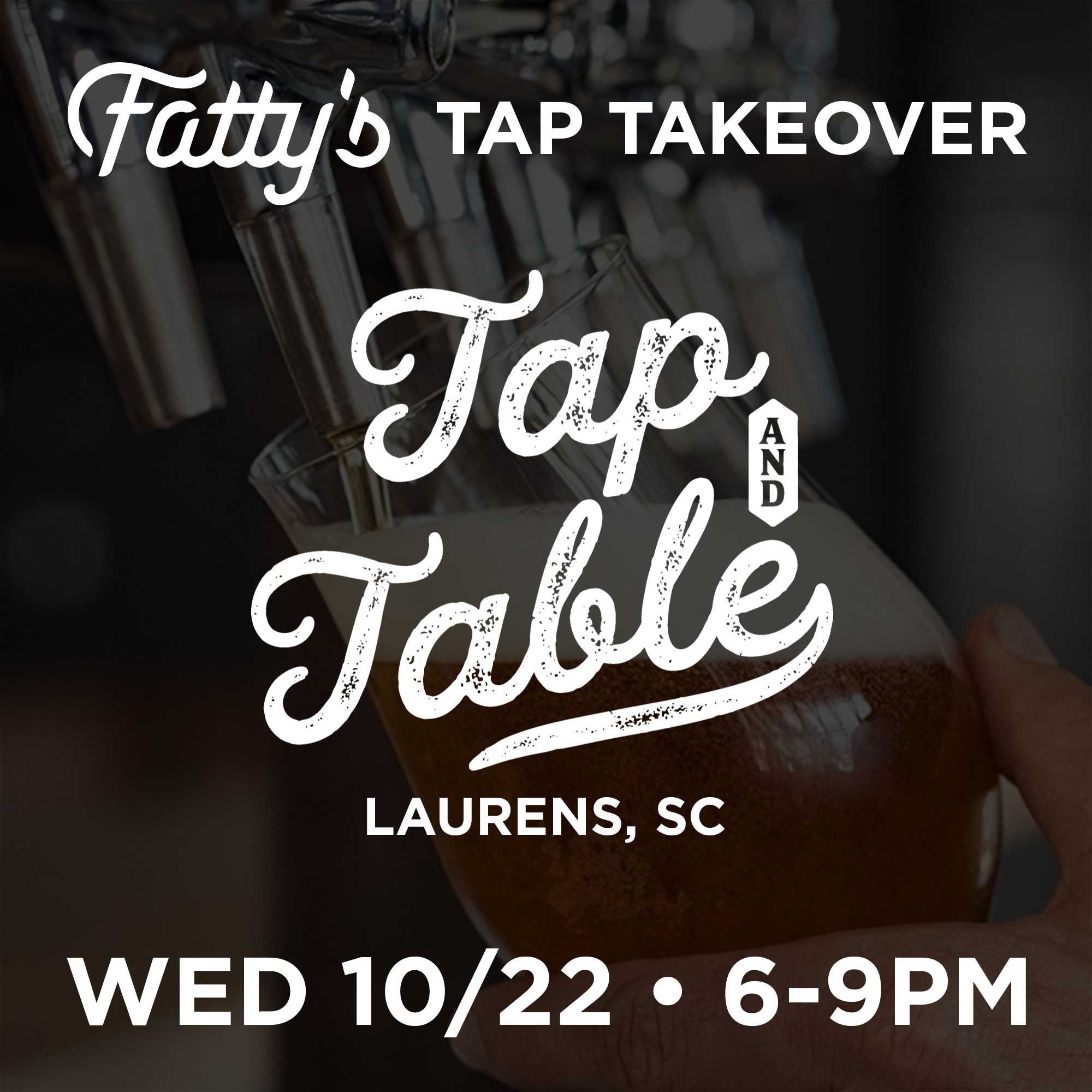 🍻🎉 TAP TAKEOVER ALERT! 🎉🍻 Mark your calendars: Wednesday , October 22nd | 6–9 PM at Tap & Table in Laurens! We’re turning the taps over to Fatty’s Beer Works from Charleston, SC 🔥 ✨ What to expect: 🍺 Fatty’s brews on draft 🎶 Live music to set the vibe 🎁 Fatty’s merch + giveaways…