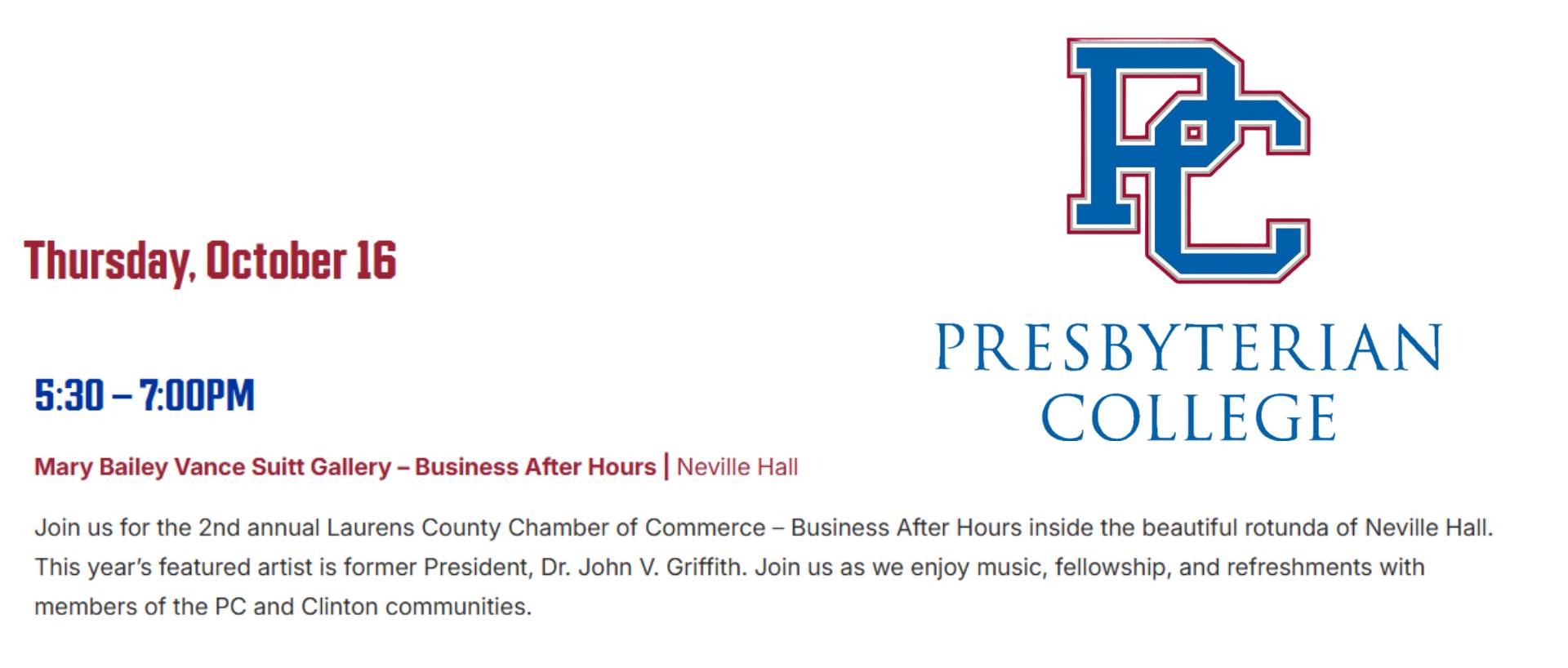 Join us for the 2nd annual Laurens County Chamber of Commerce – Business After Hours inside the beautiful rotunda of Neville Hall. This year’s featured artist is former President, Dr. John V. Griffith. Join us as we enjoy music, fellowship, and refreshments with members of the PC and Clinton communities.