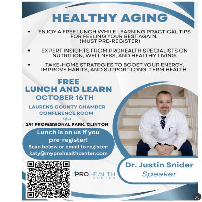 ENJOY A FREE LUNCH WHILE LEARNING PRACTICAL TIPS FOR FEELING YOUR BEST AGAIN. (MUST PRE-REGISTER) EXPERT INSIGHTS FROM PROHEALTH SPECIALISTS ON NUTRITION, WELLNESS, AND HEALTHY LIVING. TAKE-HOME STRATEGIES TO BOOST YOUR ENERGY, IMPROVE HABITS, AND SUPPORT LONG-TERM HEALTH.