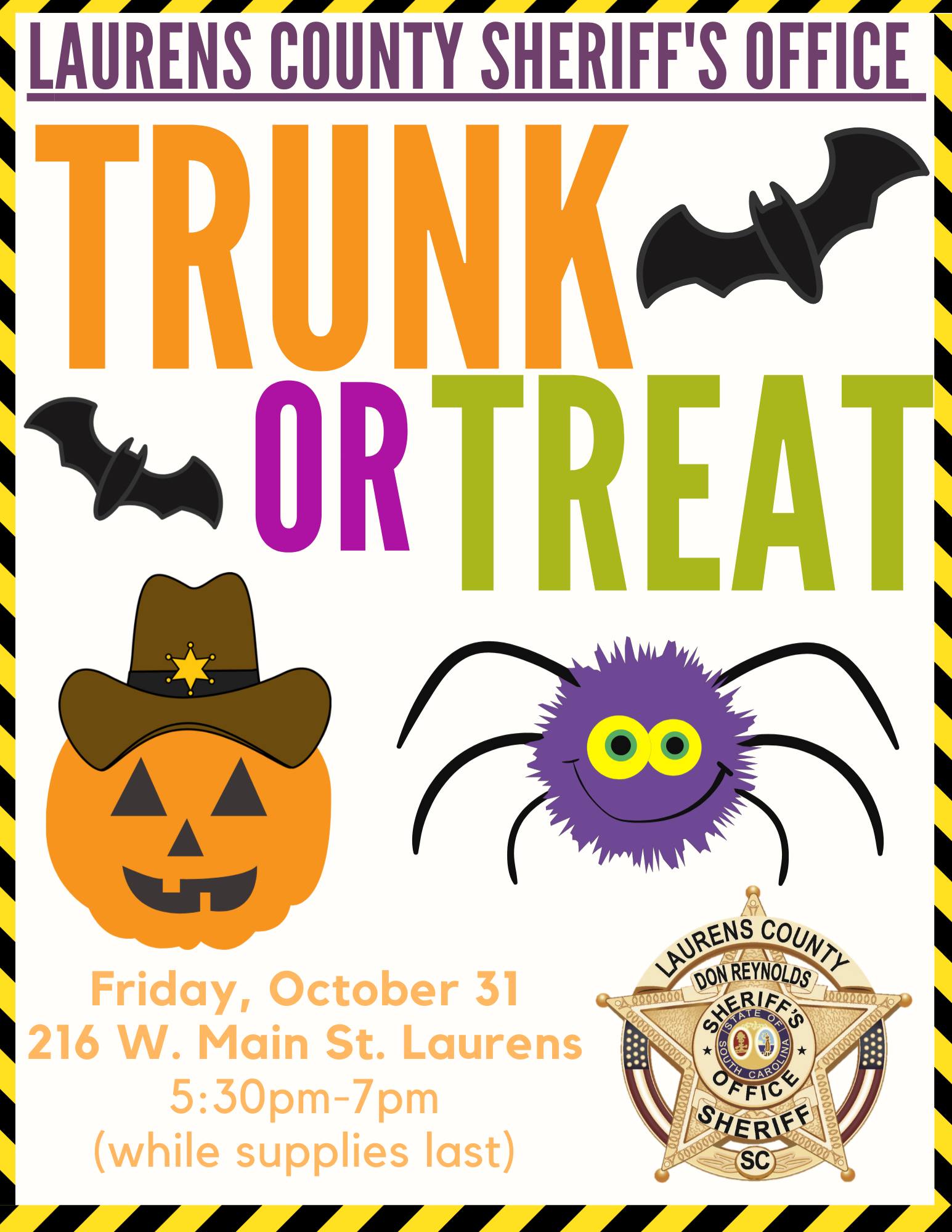 🎃 Trunk-or-Treat Coming Soon 🎃 It’s almost that time of year again! The Laurens County Sheriff’s Office is now accepting individually wrapped candy donations through October 24th for our annual Trunk-or-Treat. Start your Halloween fun right here at the Sheriff’s Office, then head down to the Spooktacular on the Square! Our event is a beloved…