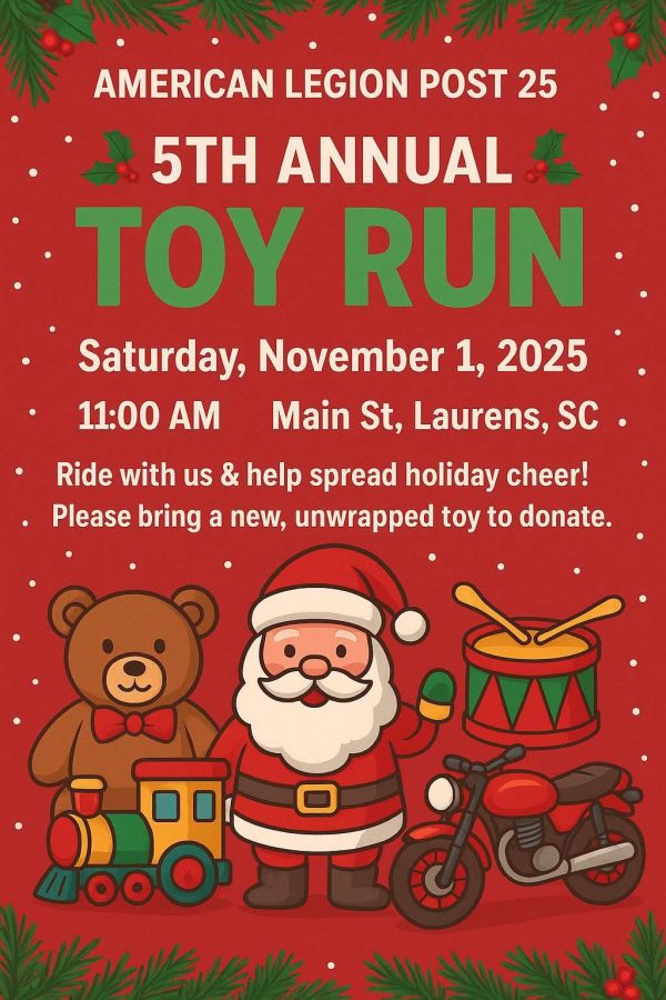 Community generosity fuels year-round projects, with Christmas for kids as a top priority American Legion Post 25 is once again rallying the community to help spread holiday cheer during its 5th Annual Toy Run on Saturday, November 1, 2025, at 11:00 a.m. on Main Street in Laurens. Riders and supporters are invited to bring a…