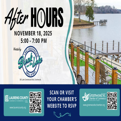 Join the Laurens County Chamber of Commerce and the Greenwood Chamber of Commerce for an evening of fun and networking. This After Hours networking event will be held at Break on the Lake on Tuesday, November 18th from 5:00-7:00 pm. This event is free and open to the public, so bring your business cards and…