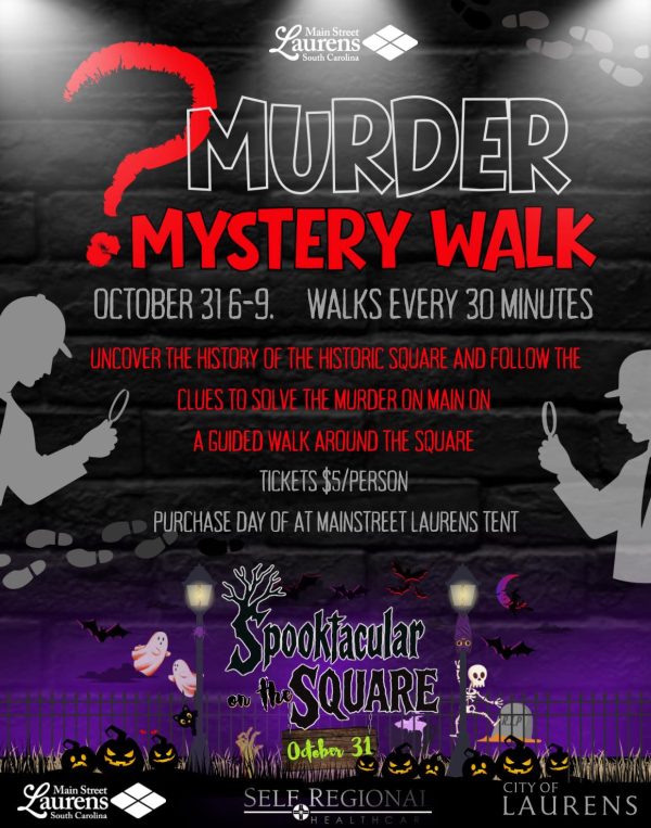 Downtown Laurens will take on a mysterious twist this Halloween night as Main Street Laurens hosts a Murder Mystery Walk during the annual Spooktacular on the Square on Thursday, October 31, from 6:00 to 9:00 p.m. Participants will join guided walks around the historic Laurens Square every 30 minutes, uncovering fascinating bits of local history…