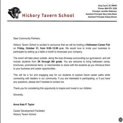 Dear Community Partners, Hickory Tavern School is excited to announce that we will be hosting a Halloween Career Fair on Friday, October 31, from 9:00-12:00 p.m. We would love to invite your business to participate by setting up a table or booth to showcase your company. The event will take place outside, along the loop…