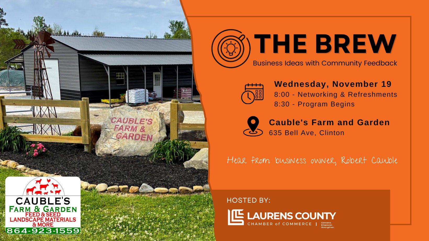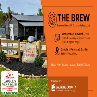Join us at Cauble's Farm & Garden located at 635 Bell Ave in Clinton on Wednesday, November 19th, to hear from business owner Robert Cauble. 8:00 - Networking & Refreshments 8:30 - Program Begins The Brew Laurens County gatherings occur bi-monthly, offering local entrepreneurs an exclusive opportunity to gain insights and guidance from the community…