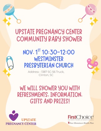 The Upstate Pregnancy Center’s “Bundles of Joy” Community Baby Shower will take place on Saturday, November 1, 2025, from 10:30 a.m. to 12:00 p.m. at Westminster Presbyterian Church in Clinton. Hosted in partnership with First Choice by Select Health, the free event celebrates expectant mothers and fathers across Laurens County, providing a joyful morning of…