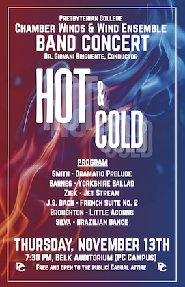 The Presbyterian College Chamber Winds and Wind Ensemble will present their fall concert, Hot & Cold, on Thursday, November 13, at 7:30 p.m. in Belk Auditorium. The performance, conducted by Dr. Giovani Briguente, is free, open to the public, and welcomes guests in casual attire. Hot & Cold invites listeners to experience music not only…