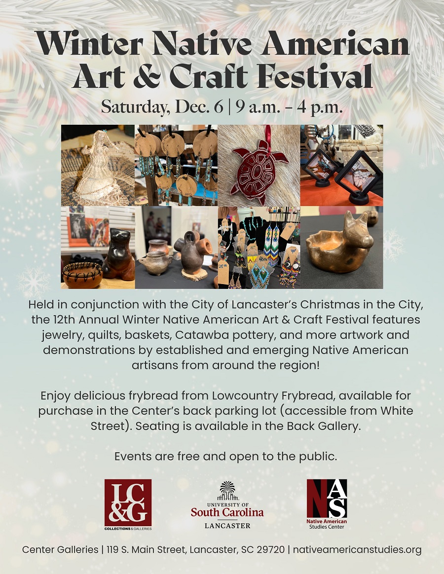 Held in conjunction with the City of Lancaster’s Christmas in the City, the 12th Annual Winter Native American Art & Craft Festival features jewelry, quilts, baskets, Catawba pottery, and more…
