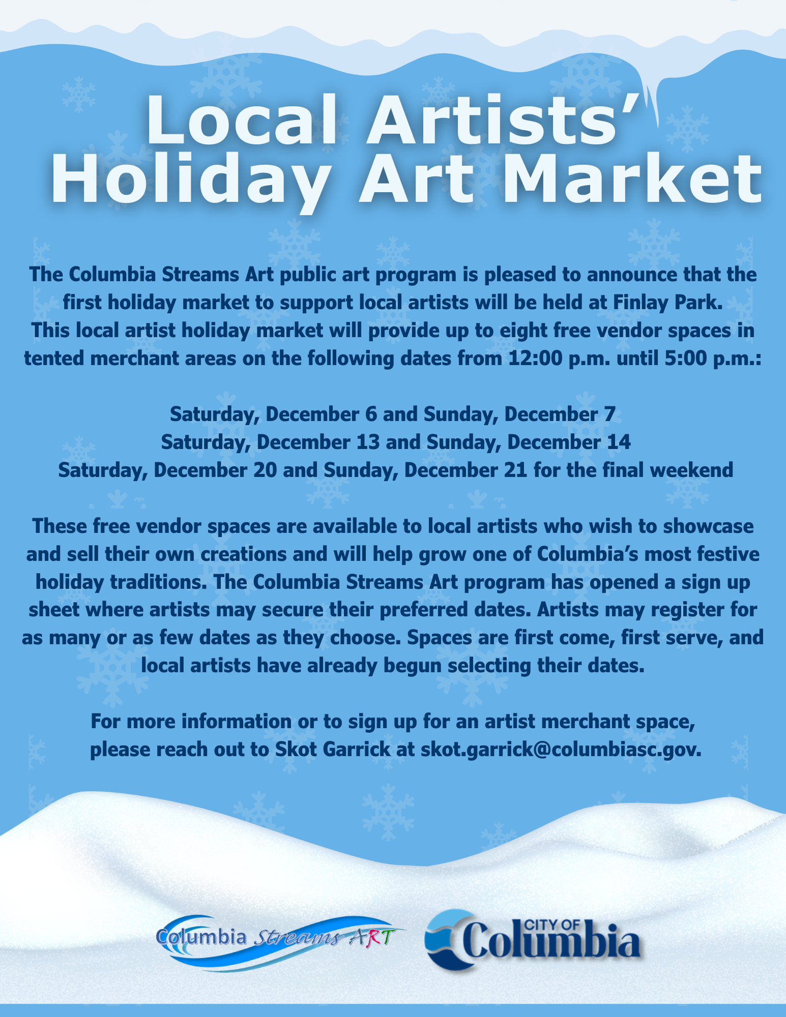 The Columbia Streams Art public art program announced that the first holiday market to support local artists will now be held at Finlay Park. This local artist holiday market will…