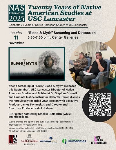 After a screening of Hulu’s “Blood & Myth” (released this September), USC Lancaster Director of Native American Studies and Folklorist Dr. Stephen Criswell and Criminal Justice Instructor Deborah Rowell discuss their previously recorded Q&A session with Executive Producer James Dommek Jr. and Director and Executive Producer Kahlil Hudson. BBQ plates catered by Smokin Butts BBQ…