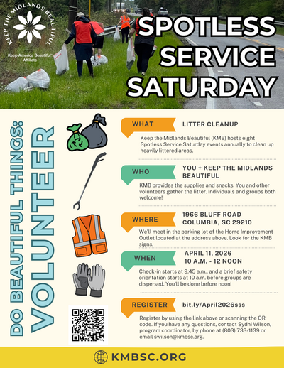 April's Spotless Service Saturday of the year will address the City of Columbia's Shop/Bluff Road on April 11, 2026, from 10 a.m. to noon. We will meet in the parking lot of the Home Improvement Outlet (1966 Bluff Road Columbia, SC 29201). More details will be emailed to you prior to the cleanup. Keep the… |