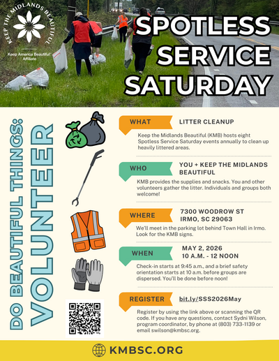May's Spotless Service Saturday of the year will address the City of Irmo's Rawl Creek on May 2, 2026, from 10 a.m. to noon. We will meet in the parking lot behind Irmo's Town Hall (7300 Woodrow Street, Irmo, SC 29063). More details will be emailed to you prior to the cleanup. Keep the Midlands… |