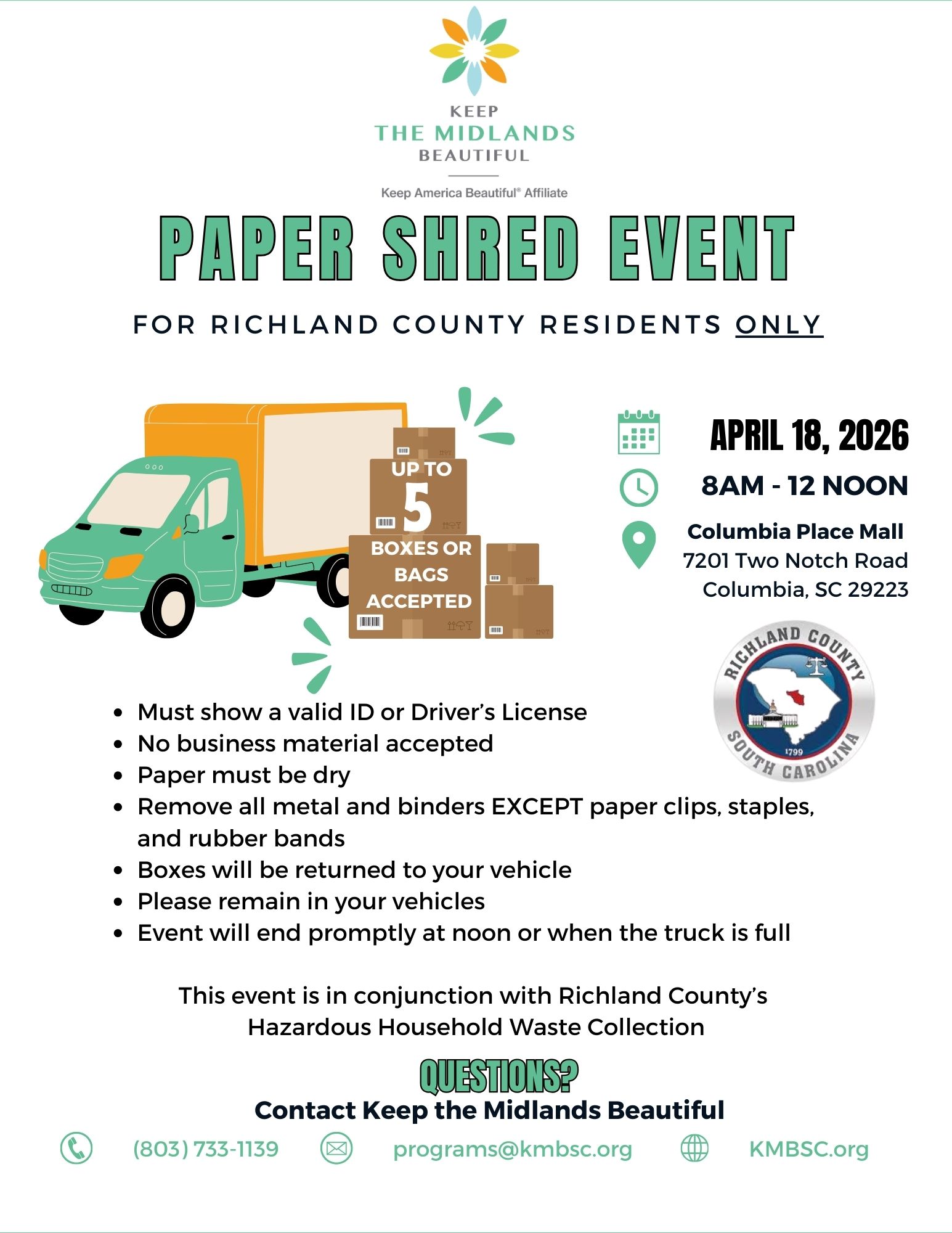 Must show a valid ID or Driver’s License No business material accepted Paper must be dry Remove all metal and binders EXCEPT paper clips, staples, and rubber bands Boxes will be returned to your vehicle Please remain in your vehicles Event will end promptly at noon or when the truck is full This event is…