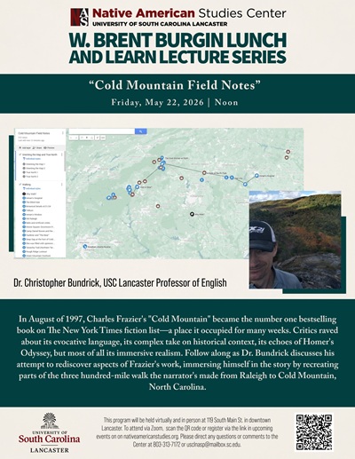 "Cold Mountain Field Notes" Dr. Christopher Bundrick, USC Lancaster Professor of English In August of 1997, Charles Frazier's "Cold Mountain" became the number one bestselling book on The New York Times fiction list—a place it occupied for many weeks. Critics raved about its evocative language, its complex take on historical context, its echoes of Homer's… |