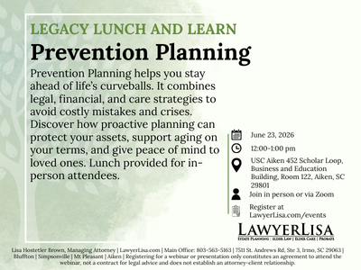 Presenter: Karl Lutterloh, Associate Attorney June 23, 2026 12:00-1:00pm EST (1hr) Virtual Via ZOOM or In Person USC Aiken 452 Scholar Loop, Business and Education Building, Room 122, Aiken, SC 29801 Prevention Planning helps you stay ahead of life’s curveballs. It combines legal, financial, and care strategies to avoid costly mistakes and crises. Discover how… |