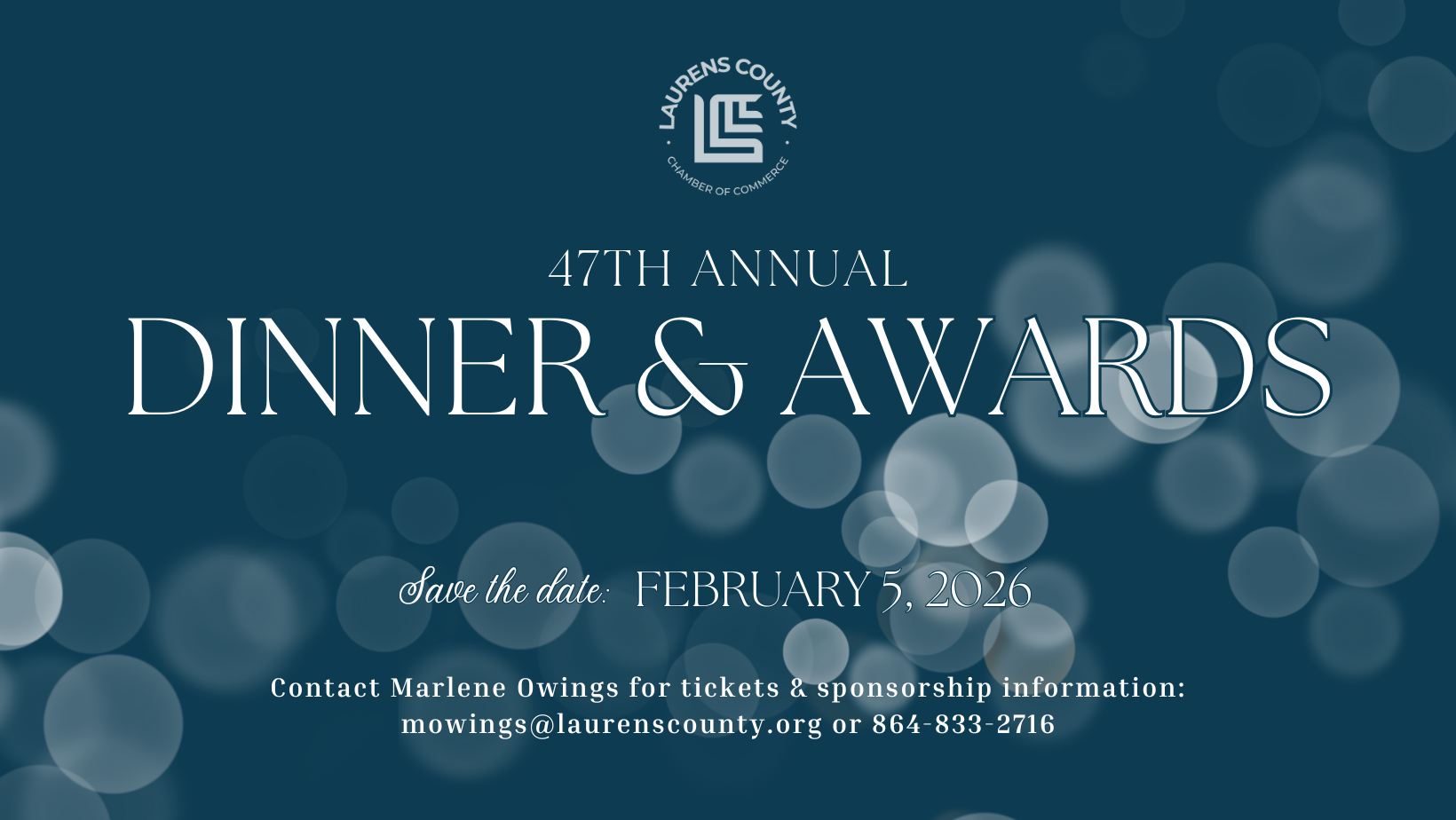 The Annual Chamber Dinner & Awards celebrates the accomplishments of the past year while recognizing our dedicated sponsors, volunteers, and community members. During the awards ceremony, we’ll honor outstanding businesses, organizations, and individual leaders for their commitment and contributions to Laurens County. Reception: 5:30–7:00 PM Dinner: 7:00 PM–until For sponsorship opportunities, please contact Marlene Owings… |