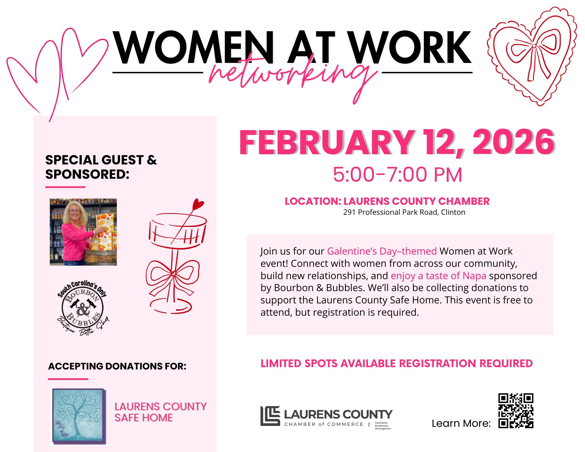 Join us for our Galentine’s Day–themed Women at Work event! Connect with women from across our community, build new relationships, and enjoy a drink tasting sponsored by Bourbon & Bubbles. We’ll also be collecting donations to support the Laurens County Safe Home. This event is free to attend, but registration is required.